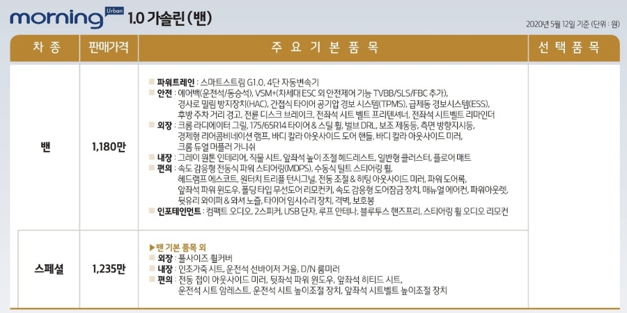 밴은 1,180만원에 가격대가 형성되었으며, 모닝어반 스페셜의 경우는 1,235만원에 가격대가 형성되어 있습니다. 여기서 스페셜의 경우 밴 기본 품목외에 풀사이즈 휠커버, 인조가죽시트, D/N 룸미러, 전동 접이식 아웃사이드 미러, 뒷자석 파워 윈도우, 앞좌석 히티드 시트(엉따), 운전석 시트높이 조절 장치 등이 적용되었으니 구매 시 참고 하시면 좋을 것 같습니다. 감사합니다.