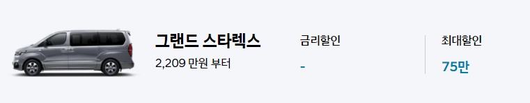 그랜드 스타렉스는 별도의 금리할인은 없으며 최대 75만원까지 프로모션 판매조건 할인이 가능합니다. 10월 프로모션 구매 가능 금액은 2,209 만원부터 가능합니다.