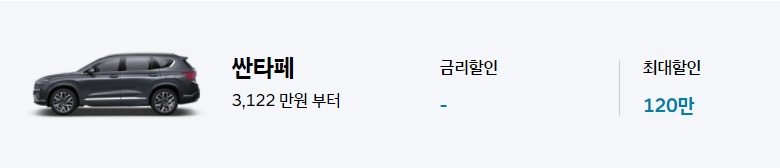 싼타페는 최저 3,122만원부터 프로모션 적용가로 구입이 가능하며 최대 할인 금액은 120만원입니다.