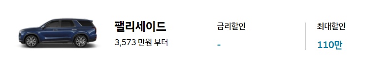 펠리세이드는 최저 3,573만원부터 구매가 가능하며, 최대 할인은 110만원까지 가능하며, 블루멤버스 포인트 선사용 40만원, 전시차 구매