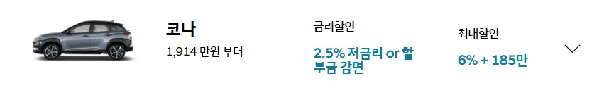 현대자동차 10월 프로모션 조건으로 코나는 최저 1,914만원 부터 구입이 가능하며, 금리는 2.5% 저금리 또는 할부금 감면 금리할인 조건이 있습니다.