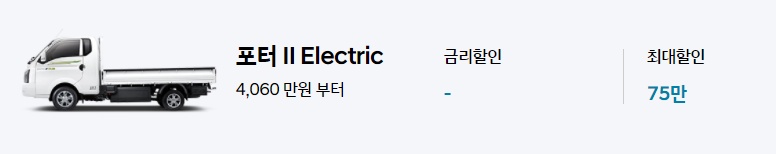 전기트럭인 포터2 일렉트릭은 최저 4,060만원부터 구입이 가능하며 최대 할인은 75만원(블루멤버스 포인트 선사용, 전시차구매, 세이브오토)가 가능합니다.