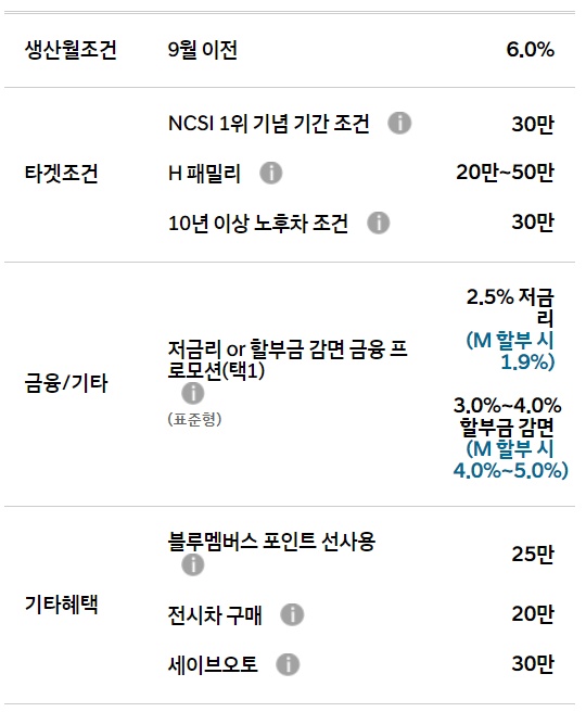 자세한 프로모션 판매조건은 블루멤버스, 전시차 구매, 세이브 오토가 있습니다.