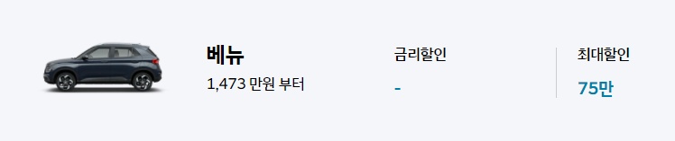 요즘 핫한 현대차 베뉴는 최대 75만원 할인이 가능하며, 블루멤버스 포인트 선사용 25만원, 전시차 구매 20만원, 세이브오토 30만원의 혜택 조건이 있습니다.