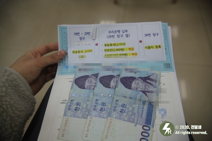 이제 수입인지를 내야합니다. 보통 구청 내 우리은행이 있기 때문에 우리은행에서 해당 업무를 담당하고, 번호판 등록비 2,800원과 함께 지불하면 됩니다.