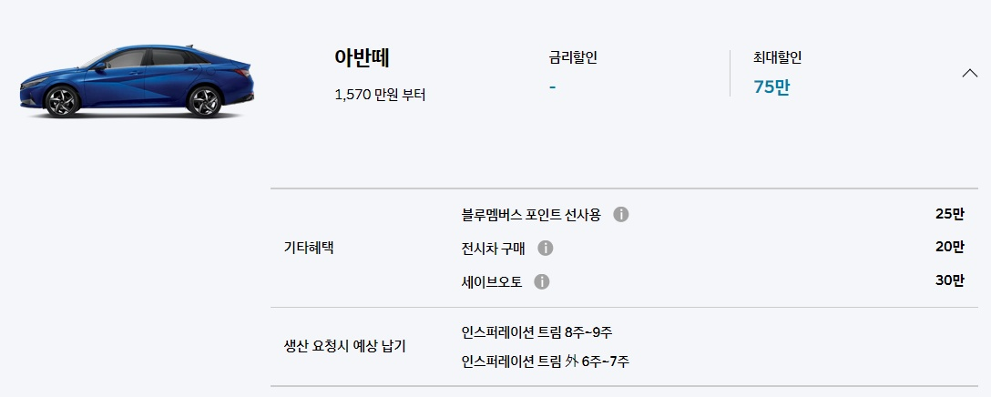 아반떼 판매 가격은 최저 1,570만원 부터 판매가 되며, 별도의 금리할인은 없습니다. 블루멤버스 포인트 선사용, 전시차 구매, 세이브 오토 모두 포함하여 최대 75만원의 프로모션이 적용됩니다.