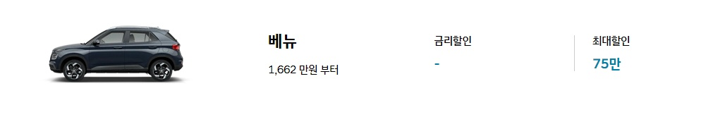 요즘 핫한 현대차 베뉴는 11월 판매조건이 그다지 좋아보이지 않습니다. 특별금리 프로모션 조건 또한 없고 최대 기타혜택으로 최대 75만원 할인이 가능합니다.