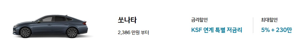 쏘나타는 현대자동차 11월 프로모션인 KSF 연계특별 저금리가 적용되어 2.5% 저금리와 생산월 조건, 타겟조건이 모두 적용되어 최대 230만원 할인에 5% 추가 할인이 가능합니다.