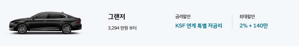 그랜저의 프로모션은 위에서 살펴본 쏘나타의 11월 판매조건보다는 덜하지만 최대 2% 할인에 140만원 추가 할인이 가능하고 금리할인 또한 적용되어 KSF 연계 특별 저금리 할인이 들어갑니다.