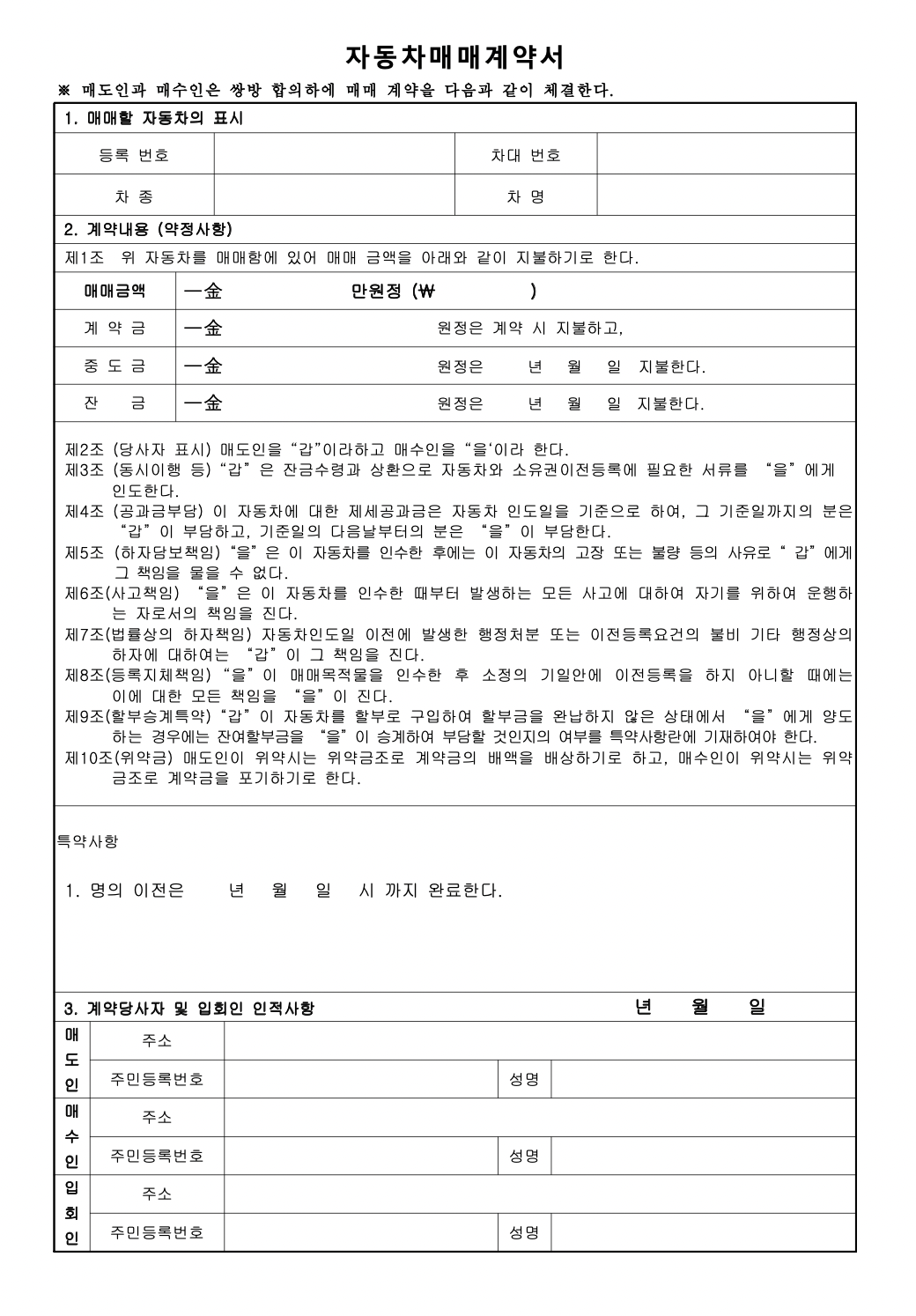 자동차 매매계약서 양식은 내가 타던 차를 중고로 팔때나 중고로 차량을 구입할 때 반드시 필요한 양식입니다. 개인과 개인간의 거래 시 반드시 필요한 서류이기에 꼼꼼하게 작성하는 것이 중요한데요. 아래에서 자동차 매매계약서 양식을 무료로 다운로드 받아보시기 바랍니다.