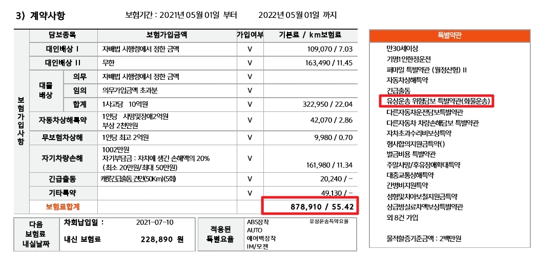 유상운송특약을 넣기 전 보다 1년 보험료(12,000km 주행시) 약 168,000원이 km당 보험료로 더 지출이 되고, 1년 기본 보험료가 18만원이 더 부과가 되기에, 일반 가정용 보험보다 기본적으로 35만원이 더 추가가 된다고 볼 수 있습니다.