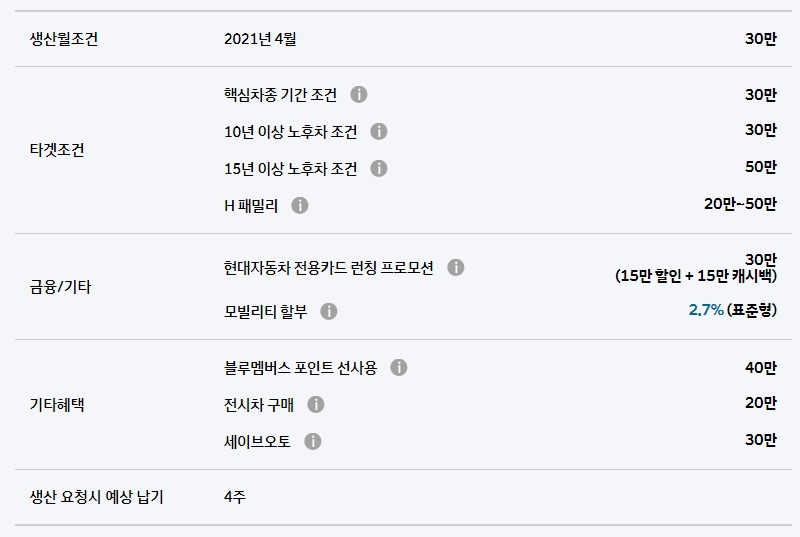 쏘나타의 경우 2021년 4월 생산차량의 경우 30만원 할인에 추가적으로 핵심 차종 기간 조건으로 소나타를 구매하는 모든 차주분들에게 30만원 추가 할인이 들어갑니다. 차량 연식에 따라 10년 이상 노후차 보유 고객은 50만원의 추가 할인도 들어갑니다.