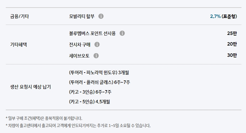 스타리아는 블루멤버스 포인트, 전시차, 세이브 오토 외 모빌리티 할부가 지원됩니다. 금리는 2.7% 표준형으로 제공되며, 생산 요청 예상 시 납기는 최장 7주 정도 소요되며 자세한 사항은 위 내용을 참고해보세요.