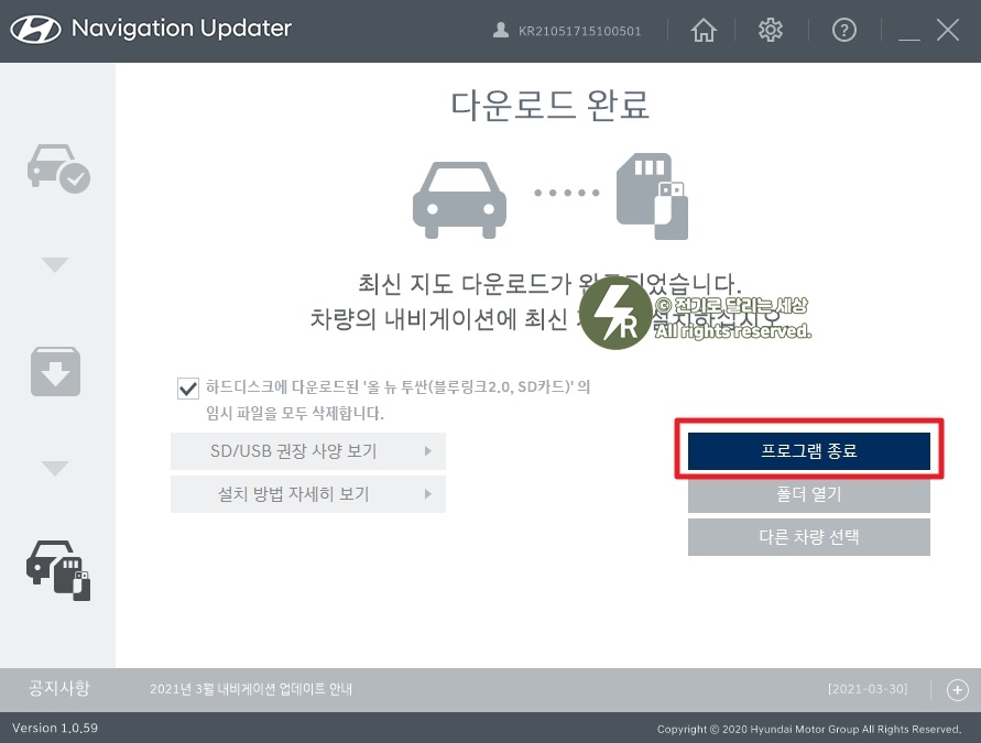 네비게이션 업데이트가 완료되면 프로그램 종료 버튼을 눌러 프로그램을 종료해주시면 되겠습니다. 이후 차량으로 가셔서 SD카드를 꼽으신 뒤 [설정] - [업데이트] 버튼을 눌러 업데이트를 진행하시면 되며, 차량에서도 업데이트를 진행하는 시간은 15~20분 가량 소요될 수 있습니다.