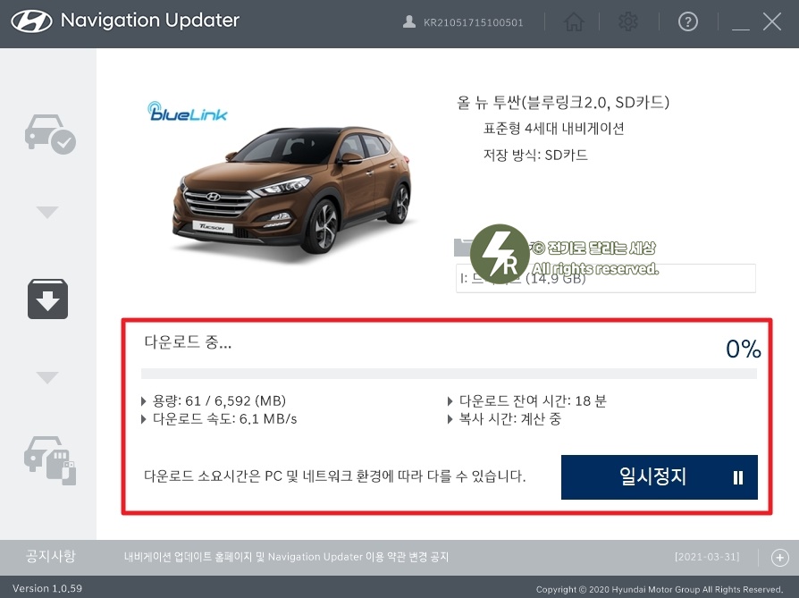 네비게이션 다운로드가 시작됩니다. 네비게이션 업데이트는 20분 가량 진행되며 절대 SD카드를 빼거나 PC를 끄면 안됩니다.( 네비게이션 업데이트 중 분리하시면 오류가 날 수 있습니다. )
