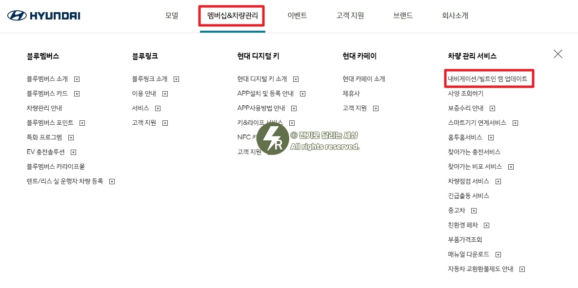 현대자동차 메인 홈페이지에 접속해주세요. 이후 상단 메뉴 중 [멤버십&차량관리] 탭에서 [차량 관리서비스] 중 [내비게이션/빌트인 캠 업데이트]를 클릭해주세요.
