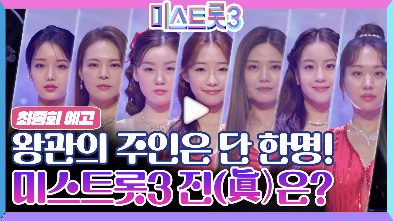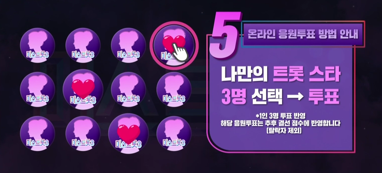 TOP10 결정전 이후 1인(계정당) 최대 3명까지 투표에 반영됩니다. 응원투표는 탈락자를 제외한 추후 결선 점수에 반영되니 나의 소중한 투표 하나로 미스트롯3 진을 뽑아주세요.