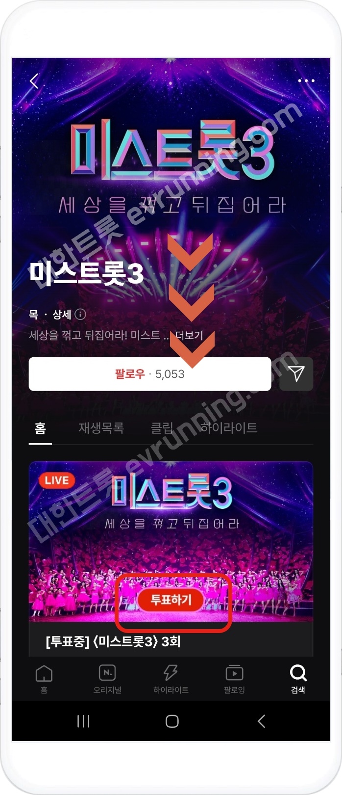 검색창에 '미스트롯3'을 검색해주세요. 이후 하단에 위치한 '미스트롯3' 페이지에 접속해주세요.