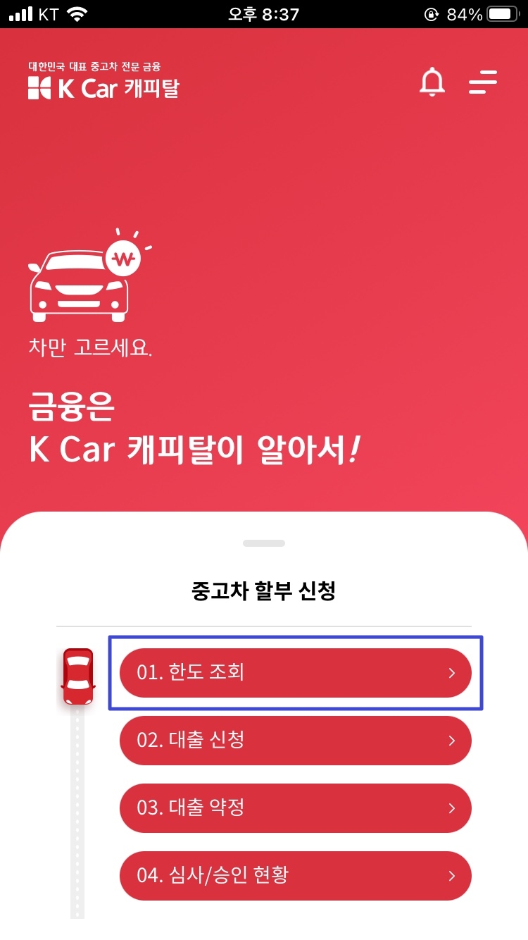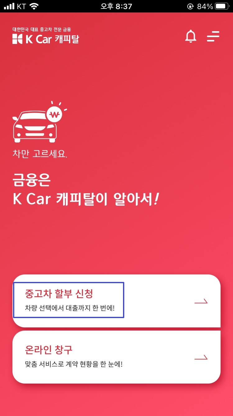 K카 중고차 할부 최대 한도를 조회하는 방법은 K카 캐피탈 어플을 통해서 바로 확인이 가능합니다. 처음에는 케이카 어플에서 한도조회를 찾아보았지만 따로 한도조회하는 방법이 나와있지 않아 찾기가 어려웠는데요.