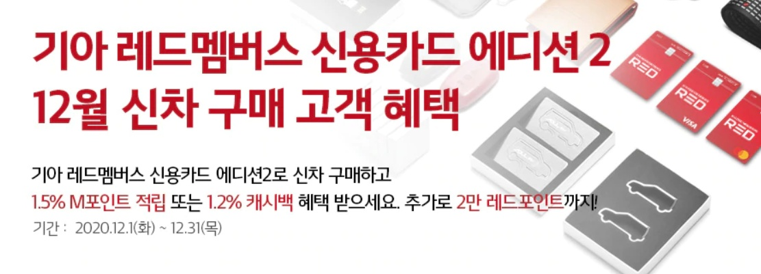 기아자동차에서는 매월 신차를 구매하는 예비차주분들을 위해 기아 레드멤버스 신용카드 및 M포인트 적립 또는 1.2% 캐시백 이벤트와 1.5% M포인트 적립이벤트와 추가로 2만 레드포인트 적립 이벤트를 시행하고 있습니다.