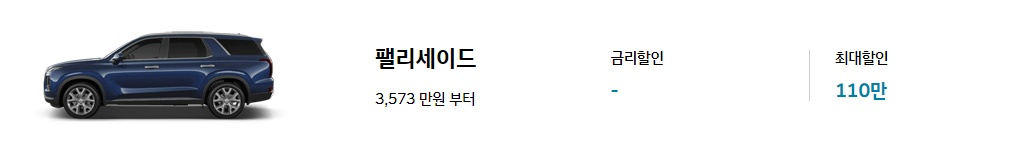펠리세이드는 이번 11월 프로모션에서 별도의 금리할인이 없는데요. 기본적으로 기타혜택(블루멤버스 포인트 선사용, 전시차구매, 세이브오토)의 혜택으로만 구성되었을 때 최대 110만원의 할인이 가능한 차종입니다.