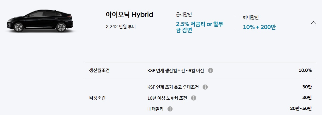 아이오닉 하이브리드는 11월 현대자동차 판매조건 중 괜찮은 조건에 속하는데요. 2.5% 저금리 또는 할부금 감면 혜택까지 있고 KSF 연계 조기 출고 우대조건 30%와 6월 이전 생산월 조건이 선택될 경우 10% 할인까지 가능하여 최대 200만원+10% 할인이 가능할 것으로 보입니다.