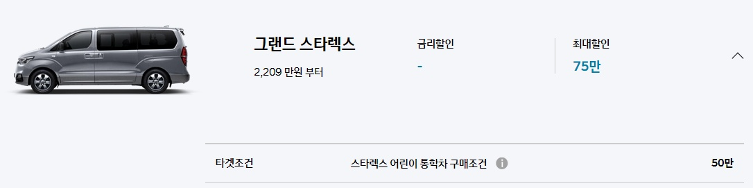 그랜드 스타렉스 또한 11월 프로모션이 그다지 적용되어 있지 않아 최대 75만원의 기타기본 혜택으로 구성됩니다. 하지만 타겟조건으로 어린이 통학차 구매조건이 포함된다면 50만원을 추가로 할인받아 최대 125만원까지 혜택이 가능할 것으로 보입니다.