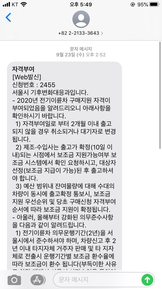 전기 이륜차 보조금에 당첨(선정)되었다면 아래와 같이 문자메시지가 오며, 이후 등록절차는 다음시간에 살펴보도록 하겠습니다. 감사합니다.