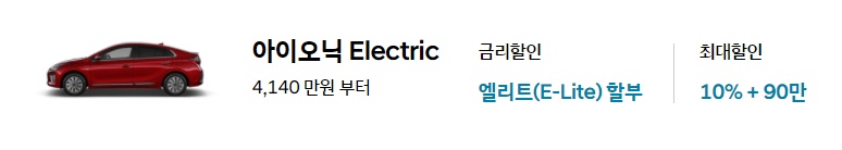 아이오닉의 원조라고 불리는 전기차 아이오닉 일렉트릭은 금리할인이 엘리트 할부가 가능하며, 최대 10%할인에 90만원 추가 10월 프로모션 판매조건이 적용됩니다.