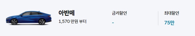 아반떼 판매 가격은 1,570만원부터 시작되며 별도의 금리할인은 없습니다. 이번 현대자도아 10월 프로모션 적용 시 최대 75만원의 할인혜택이 있는데요.