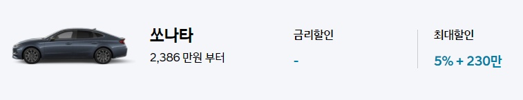 쏘나타도 역시 별도의 금리할인이 없으며, 최대 5%할인에 추가로 230만원 할인이 가능합니다.