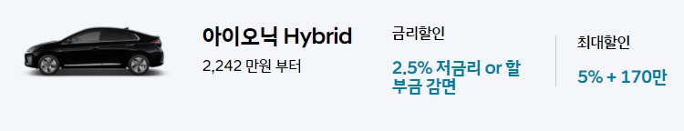 곧 아이오닉 브랜드로 정규 출시가 되면서 아이오닉에 대한 관심도가 높은데요. 아이오닉 하이브리드는 금리가 2.5% 저금리부터 할부금 감면 선택이 가능하며, 최대 5% 할인 추가로 170만원 까지 추가 할인이 가능합니다.