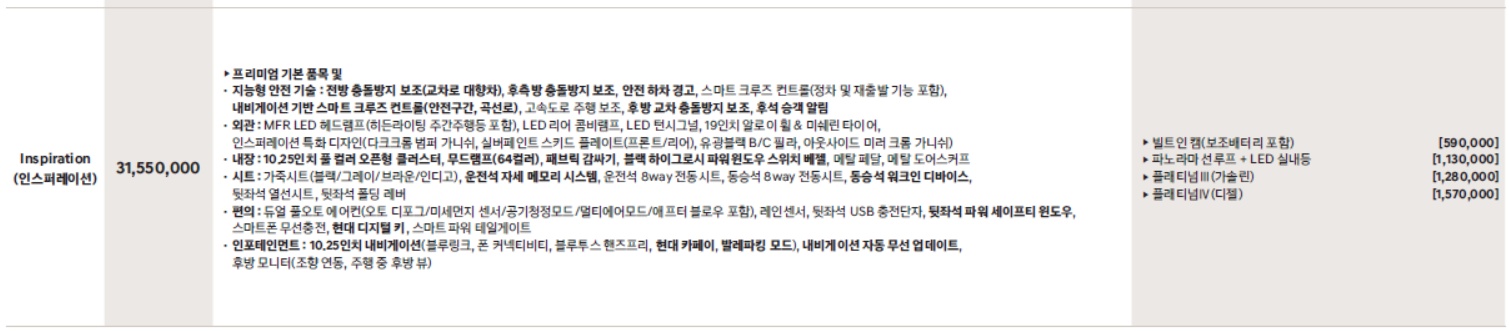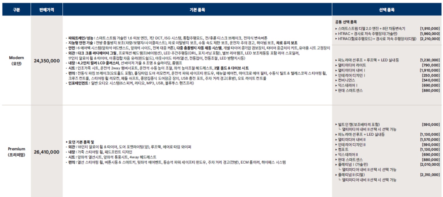 투산 하이브리드 가격은 개별소비세 3.5%를 기준으로 한 세제혜택이 반영된 가격으로 말씀드릴텐데요. 트림에 따라 상이하지만 하위 트림인 모던 2,857만원부터 상위 트림인 인스퍼레이션 3,467만원까지 형성되어 있습니다.