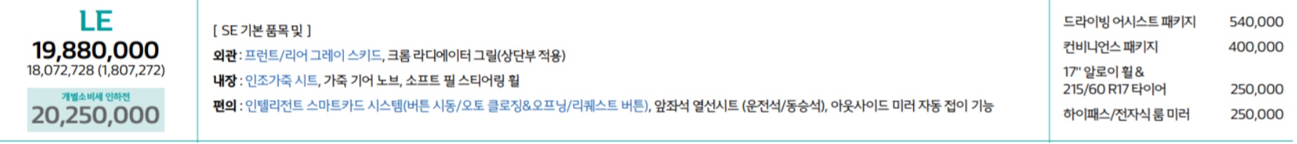 | LE(TCe 260) | 21,750,000~ | SE(1.6 GTe) | 17,950,000~ |