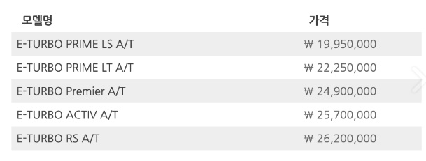 트레일 블레이저는 트림마다 상이한 경향을 보여줍니다. 가장 보급형 트림인 LS는 1,995만원을, 그 다음 상위 트림인 LT는 2,225만원, 프리미어는 2,490만원, AC TIV트림은 2,570만원으로 구성되어 있습니다. 또한 최상위 트림인 RS는 2,620만원으로 소형 SUV의 가격대치고 괜찮은 가격대를 보여줍니다.