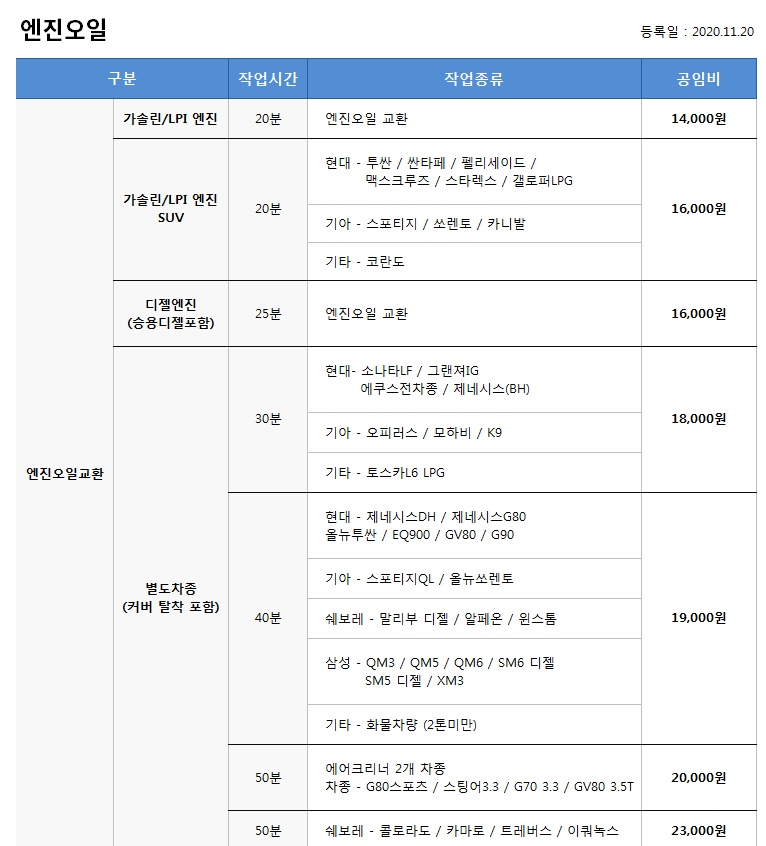 간단한 오일류 교체나 종합점검을 받아보신다면 공임나라를 이용하시길 추천드립니다. 공임비가 투명하게 등록되어 있고 예약을 하시고 방문하시는 것을 추천드립니다.